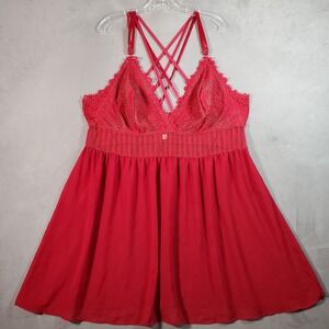 Cacique plus-size red lace babydoll with sheer skirt and crisscross strappy back. Adjustable straps and an empire waist for a flattering fit. Soft nylon/spandex blend. Women's size 26/28. Styling note: also works as a Y2K cami top or micro mini dress—layer over a tee or under a moto/denim jacket for vampire, fairy, coquette, goth, or grunge-inspired looks.