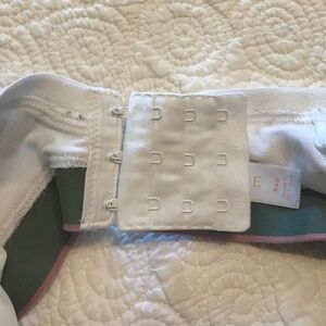 “Cotton boost plunge” bra by Cacique (by Lane Bryant) in white with a subdued floral pattern in mauve and green, with the same colors in stripes on the band. More autumnal. Underwire. Materials in pics. Size 44B. Hand wash (or machine wash in a bag) in cold water, line dry. Built-in padding adds a wonderful boost for cleavage. Three hooks in back for excellent support. Gently worn, this is in great shape—I just shrunk out of it. I have about 50 Cacique boost plunge (mostly cotton, some “smooth”) available in this size—good discounts for bundles!
