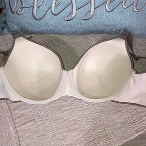 NWT size 38D Cacique (from the modern invisible back smoother collection) lightly lined underwire balconette bra in a shade of nude/tan color with a leaf pattern.