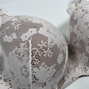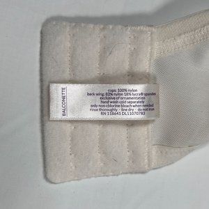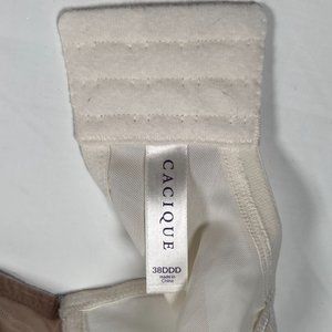 Cacique Balconette. White lace over beige with 4 hook closure. Photo 6 shows small tear in mesh, does not effect wear or fit.
