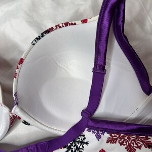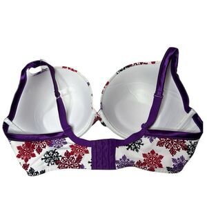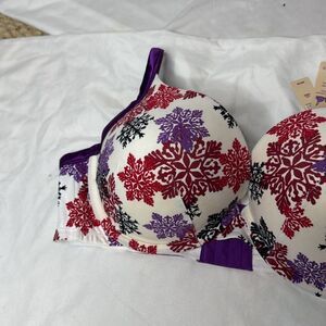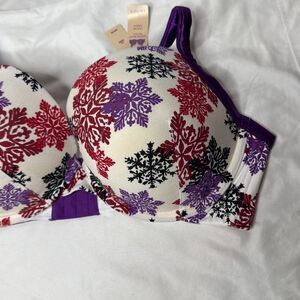 Cacique Snowflake Print Cotton Boost Plunge Bra. Size 44D. Experience the elegance of Cacique's floral print bras, crafted in vibrant purple and red hues. These bras feature delicate lace trim and a soft fabric blend, offering both comfort and style. Perfect for adding a touch of sophistication to your intimate collection. New without tag.
