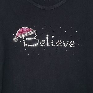 Cute Christmas Santa "Believe" Silver Rhinestone Black Knit Holiday Shirt Sz M. 3/4 length sleeves, 100% cotton knit, eye-catching glitter design. Missing 2 small rhinestones (on B and on second E). Otherwise in nice gently used condition.