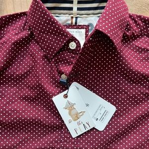 Cactus Boys brand button down shirt. Long sleeves and barrel cuffs. Charming white spot pattern on burgundy. Suitable for multiple occasions