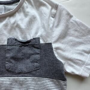 It features a stylish white and gray color block design, a comfortable crew neck, and short sleeves.