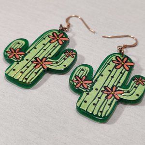These cute cactus earrings are so cute! They hang about 2.5 inches and are a little over an inch wide. The hooks are a copper color that matches the pink flowers but I can swap them out for silver if you prefer. New, never been worn.