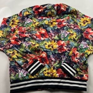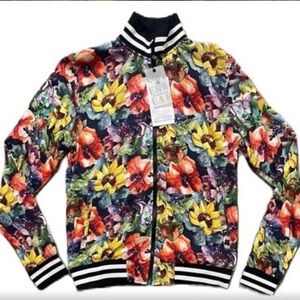Vibrant floral design. Black collar and cuffs. Striped accents.