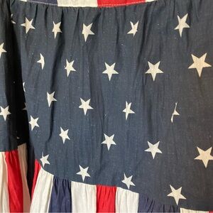 Patriotic American flag print broom skirt. Pleated, long, maxi skirt. Flag theme with Stars and Stripes in red white blue color scheme. Elastic waist with slight stretch. Labeled as One size average. I’d say it’s closest to a Large.