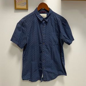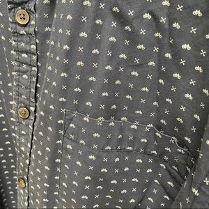 VG condition. Fun, lightweight button up for spring / summer. Small bike and wrench pattern. Dark blue.