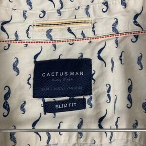 Cactus Man Button Shirt L Slim Fit White Blue Short Sleeve Mustaches Handlebar