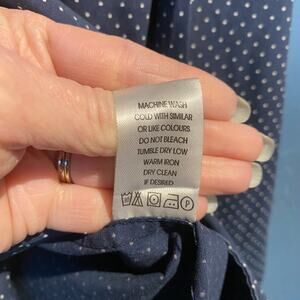 This navy blue shirt features a fun white polka dot pattern, perfect for adding a touch of personality to your outfit.