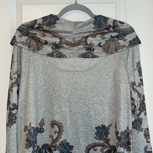 Cactus + Pearl Floral Paisley Cowl Neck Tunic Sweater, size XL. Multicolor floral and paisley print on heathered light gray background. Long sleeves, cowl neck, sharkbite hem, tunic length.