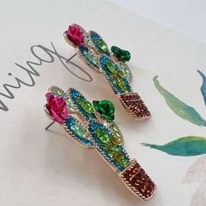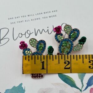Adorable, fun and sparkly cactus rhinestone earring with pink and green bloom.