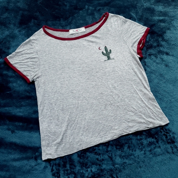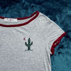 This gray and maroon short-sleeve ringer t-shirt has a desert cactus design printed on one side of the upper chest area. Light fabric, easy to style, casual shirt for any day.