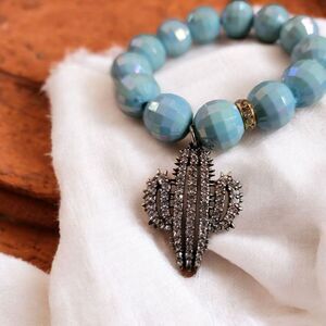 This elegant bracelet features stunning blue beads paired with a striking silver tone prickly cactus pendant. Perfect for adding a touch of sophistication to any outfit.