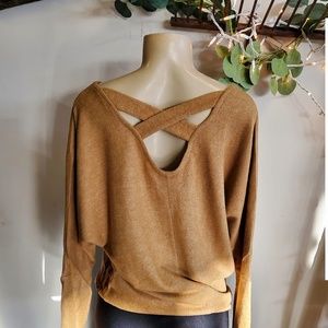 This v-neck sweater has a dolman sleeve and cross straps on back neckline. It is a soft light-weight acrylic blend fabric for easy care.