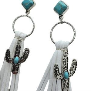 Cactus White Fringe Earrings Boho Southwestern Western Pierced Women's Jewelry