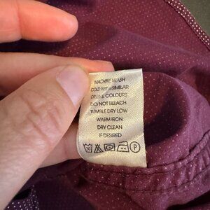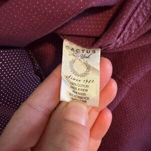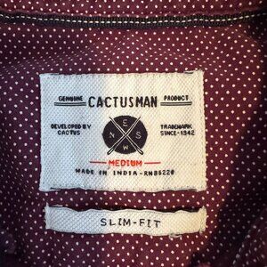 Cactus Man by Ricky Singh Slim Fit, short sleeve button up, in a deep maroon color with tiny white polka dots. Excellent pre-owned condition.