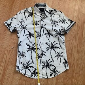 Short sleeve, button down w/ contrasting black buttons, tropical palm tree print, striped detail inside arm cuff. In good condition!