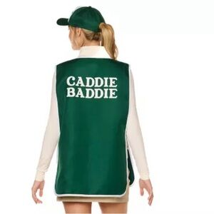 Get ready for your next event with the Caddie Costume Set. This set includes a reversible caddie bib and hat, perfect for any golf-themed party. The green and white colors add a classic touch to your outfit.
