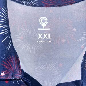 The Caddy Cart Men's Polo in size 2XL features a multicolor fireworks print and is made from a blend of polyester and spandex. This regular fit, short sleeve polo has a collared neckline with a button placket for comfort and performance. Ideal for casual summer occasions, it is machine washable for easy care. Pre-owned.
