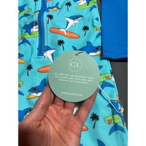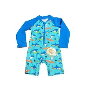 The Caden Lane 12-18 Month Rash Guard Swim Suit is a stylish shark-themed swim shirt with a palm tree design, perfect for young boys. Made from a comfortable blend of nylon and spandex. The blue color adds a fun and vibrant touch to the overall design, making it a great choice for a day at the beach or pool. It comes in a size 12-18months in blue with a shark print, and is new with tags!