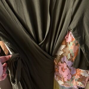 Stylish olive green maternity dress paired with a white baby blanket featuring a leaf print. Perfect for new moms. Like new just need a little steaming
