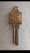 Gold/brass colored car key with diagonal script of Lion & Lamb in the design among insignia of Cadillac automobile markings. Crown top key with AB stones lined across.