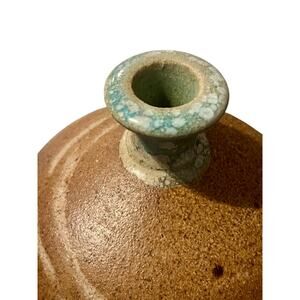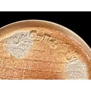 Handmade stoneware bottle vase by Cady Clay Works of Seagrove, North Carolina—America’s storied pottery village. The studio is led by potters John Mellage & Beth Gore, known for wheel-thrown forms and earth-toned, ash-influenced glazes that celebrate Carolina clay. This ovoid bottle (approx. 9" H x 6.5" W) features a sandy, textured body with cream slip bands spiraling the form and a celadon-blue, crackled rim. Base bears the Cady Clay Works stamp and a handwritten ’02, indicating production circa 2002 in Seagrove. A warm, minimalist accent that fits rustic, wabi-sabi, Japandi and modern farmhouse spaces.