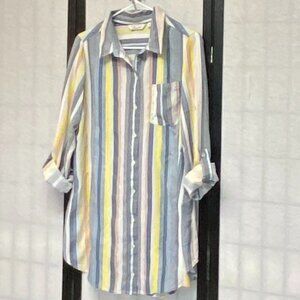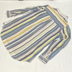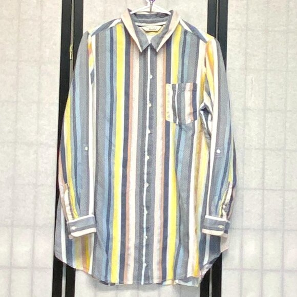 Long Sleeved Full Button Front Collared Stripe Oversize Tunic Top from Caffe Marrakesh. Lovingly worn – looks in excellent condition. Light weight shirt is designed with button placket front, pointed collar and single pocket on front. Relaxed silhouette with vertical stripes made up of tiny lines on white background with navy, yellow and tan. Long sleeves with buttoned cuffs. Band inside to hold shorter rolled length. Over shoulder back yoke with pleat at center back. Curved shirt tail hem. Hits above knee. A flattering, breezy silhouette that works year-round!
