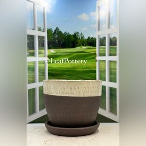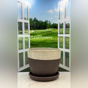 Dimensions: 6.5”H x 7.5”, Opening 7”, weight 4lbs 0.9oz, Material: Clay/Concrete, saucer attached to the planter, Drainage hole, Color: Brown and Beige, Made in China , Perfect for Indoor/ Outdoor gardening, Don’t forget to dress up your plants 🪴