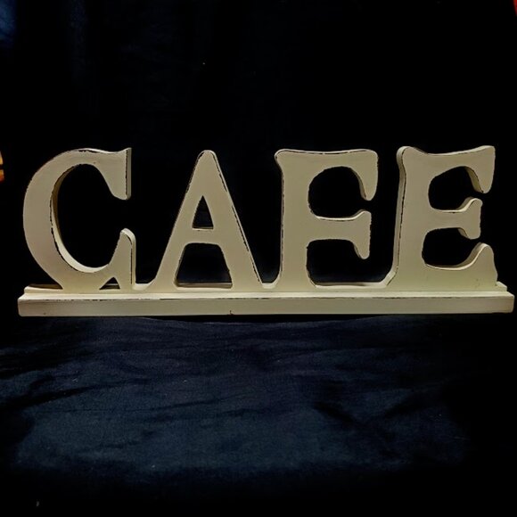 wooden Cafe sign stands on its own