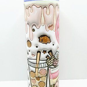 This tumbler features stainless steel straw and should be washed by hand only; microwaving is not recommended.