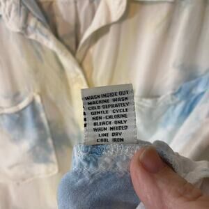 Lightweight and breezy Caffé Marrakesh tie-dye button down shirt. Features pastel blue and white tie-dye design with a front tie hem, two chest pockets, and relaxed fit. Made from 100% rayon for a soft drape and breathable feel.
