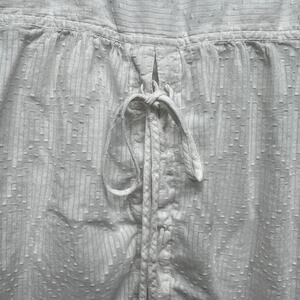 Caffe Marrahkesh women's white shirt. Collared. V-neck. Button down. Long roll tab sleeves. Buttoned cuffs. Chest pocket. Back slit with lace up detail. Textured fabric. Relaxed fit. In good used condition. No stains, tears or holes.
