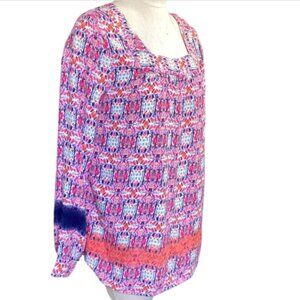 Description: BOHO Mixed Pattern Peasant Blouse Long Sleeve Button Cuff Square Neck