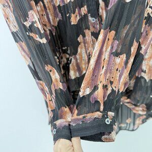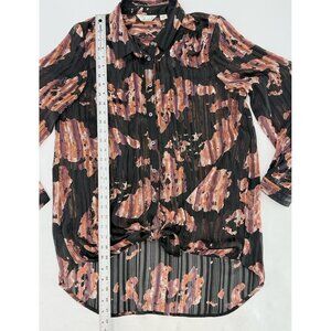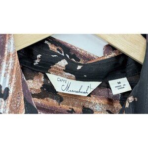 Elevate your wardrobe with this stylish and versatile blouse from Caffe Marrakesh. Featuring a black and pink striped pattern, short sleeves, and a collared neckline, this blouse is perfect for any occasion. The tie closure adds a touch of elegance, while the button accents provide a casual yet chic look. Made from lightweight chiffon material, this blouse is comfortable and relaxed, making it perfect for travel, parties, cocktail events, workwear, or casual outings. With its Bohemian, preppy, and beachy themes, this blouse is a must-have for any fashion-forward woman. This blouse is ideal for the summer, fall, and spring seasons, and it is made of high-quality polyester material. The blouse is a size M, and it is designed to fit regular sizes. Add this blouse to your collection and enjoy a chic and comfortable look any time of the day. Good used condition. No stains or holes found. Please feel free to ask any questions.