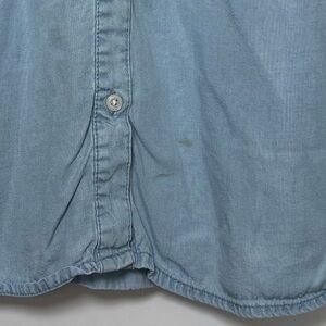 Stylish lightweight denim shirt with button-down front. Features short sleeves and a ruffled neck.