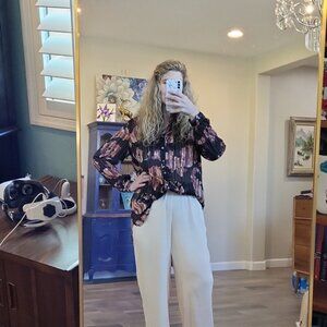 Caffe Marrakesh Black Pink Stripe Gold Metallic Front Button Chiffon Long Sleeve Tunic Blouse