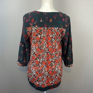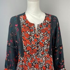 Caffe Marrakesh orange and dark grey multi floral tunic top. Size Small. In good preowned condition. No stains. Armpit to pit measures approximately 20 inches. Top of shoulder down approximately 26 inches long. Buttons 1/4 way down. 3/4 length sleeves. Comes from a smoke free home.