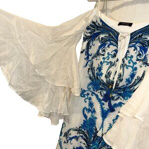Caffe SWIMWEAR 100% SILK indigo blue print flutter cold shoulder sleeve tunic COVER UP top S