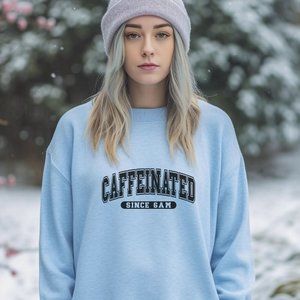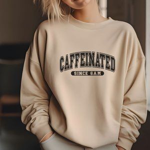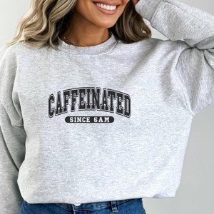 Caffeinated Since 6 AM front print long sleeve unisex round neckline sweatshirt top. The Caffeinated Since 6 AM Women Unisex crewneck Sweatshirt is the perfect addition to your wardrobe. Made with high-quality cotton and polyester blended materials, this sweatshirt is both comfortable and stylish. The simple yet eye-catching design features the words "Caffeinated Since 6 AM" in bold letters across the chest, making it a great choice for casual outings or lounging at home.