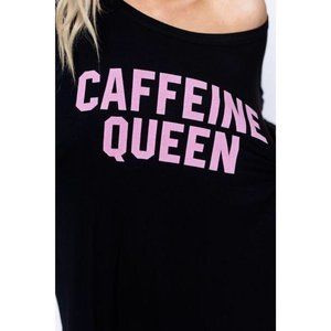This easy to wear graphic tee features the phrase "Caffeine Queen" across the front in pink block letters. It is super soft and comfy. It is an oversized fit.