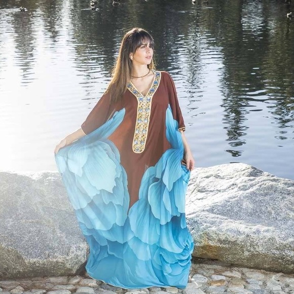 Beautiful caftan made from an awesome sequins fabric, very flashy and the colors blend in very nicely. Enriched with handmade Moroccan gold trims
