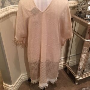 Caftan Cream & Sage w Fringe Drops Split Sides. Adorable Vince Camuto tunic! The long tunic is slightly See through so wear an undershirt. I only tried on. So cute just the shade of green is a lovely darker rustic sage than hue I thought. See house of harlow necklace, green scarf & jeans, sold separately styled w fringe booties!