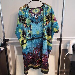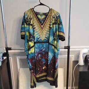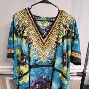 Designer print caftan dress. Stunning bold colors of teal and rich purple enhance this figure flattering, forgiving dress. The garment features a V-neckline with a detailed, gold-colored embellished design. The pattern on the caftan includes various abstract and ornate motifs in shades of blue, purple, and black.