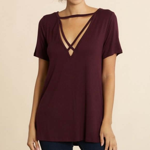 Super soft caged front top. Very comfortable & can be dressed up or down! Color is deep wine/burgundy