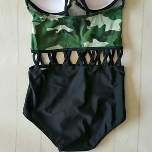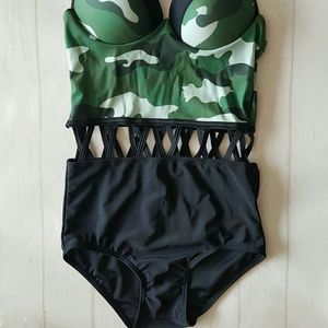 Loving this military chic look! Combines rugged camo print, adjustable straps, padded chest, caged/cut out midsection and a classic slimming black bottom. It flatters where.you might need it, supports and adds eye catching details. Price is firm. Add an "Everyone Loves a Country Girl" tank to get 10% off. And a cover up, 15% off. Need a pair of sunnies, too? 20% off everything and only 1 shipping fee!