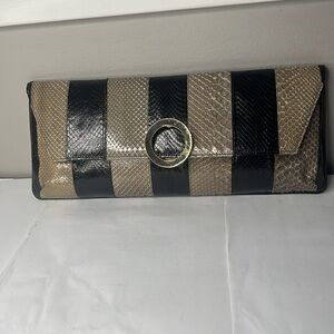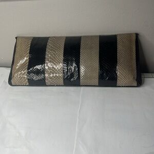 This is a gorgeous Caggiano Large Long 15.75” Python and Calf Leather Clutch Bag Made in Italy. Black Gray Beige Python with full calf interior and piping. A small interior tear in the interior, unseen when carried.