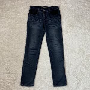 Dark wash straight leg denim in a mid rise. Traditional 5 pocket cut, with Knit and graphic embellishment that reads "Speed and Wheels and" on back pocket. Front pockets have knit inner, with frayed edges along the pocket edge. Back tag is genuine cowhide with hair still intact, and features a gold attachment that reads display.