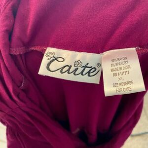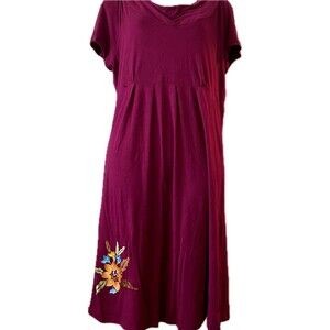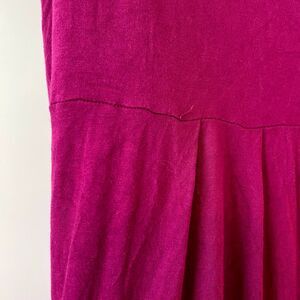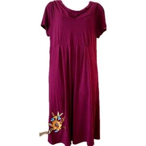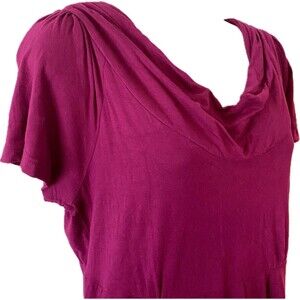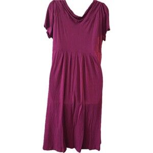 This lovely raspberry colored knee/mid-length dress is so soft and stretchy, and gorgeous on. Cap sleeves with a cowl neckline and a beautiful orange and turquoise floral print on the bottom, this empire waist dress is incredibly flattering. There's a slight separating happening at the seam of the empire waist that can be seen in the 8th picture. Not terribly noticeable. Any questions, please ask! Priced to sell!
